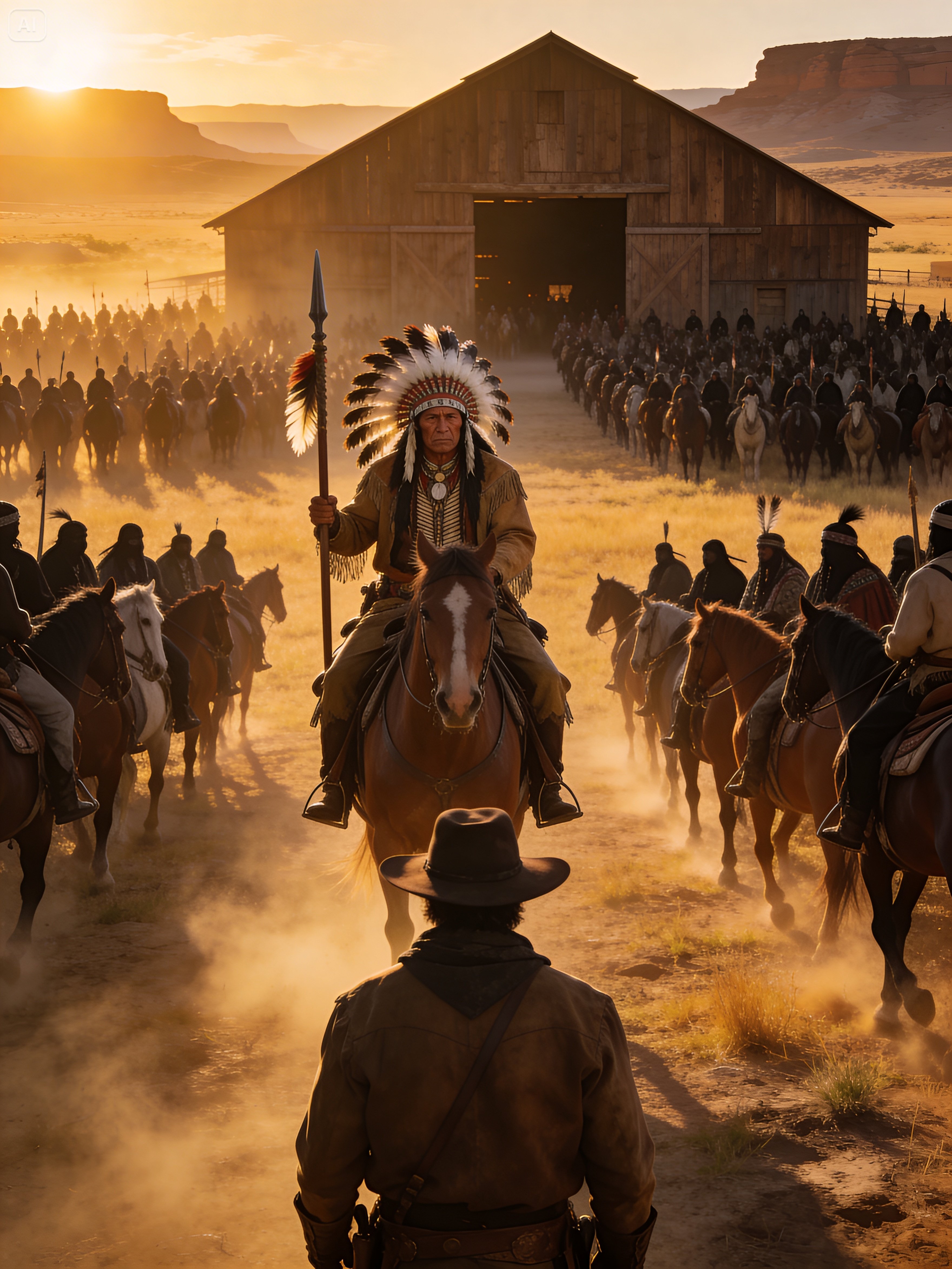 The sight before him was worse than anything he had imagined. The warriors formed a complete circle around the property, mounted and motionless. At the front sat White Bull himself, a massive figure on horseback, silver threading through his long black hair, his face cut from fury and control. The girl ran straight toward him, calling out in Comanche.
