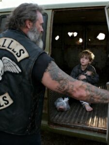 Sometimes it comes in wet leather, with a scar through its eyebrow, a dog at its side, and enough brothers behind it to shake an entire city awake.