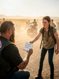 She hit the sidewalk hard enough to stagger, caught herself, and nearly crashed straight into a row of black boots planted in front of the Rusted Crown Bar, where fifty motorcycles stood in a line that gleamed under broken neon and fifty men in black leather vests had gone quiet all at once because one terrified child had just torn open the night in front of them.