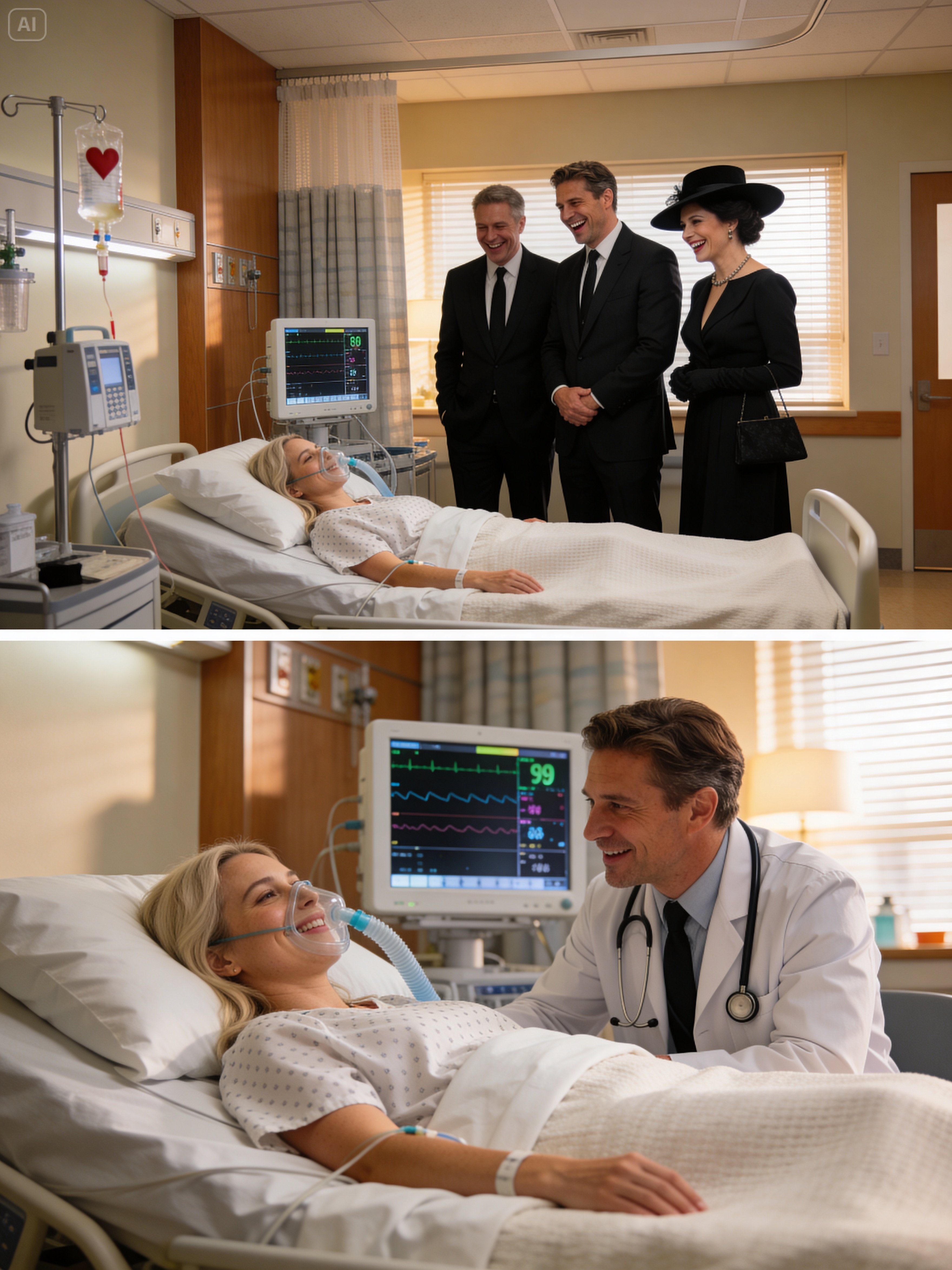 They stood beside her bed in black clothes, but there was no grief in the room. Only calculation. The kind that smiles carefully in hospitals because nurses are nearby and death likes witnesses more than accusations.